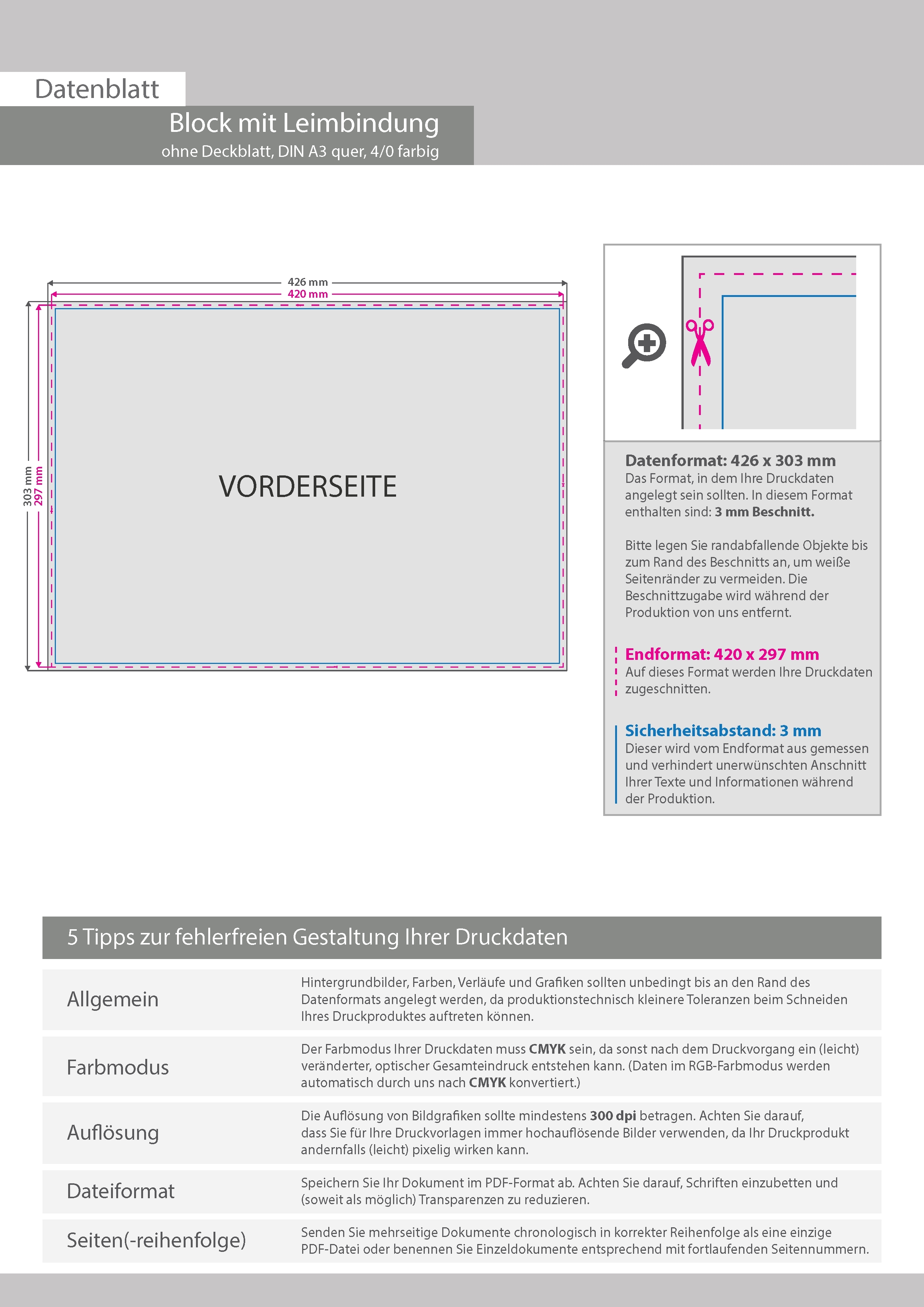 Block mit Leimbindung, DIN A3 quer, 25 Blatt, 4/0 farbig einseitig bedruckt