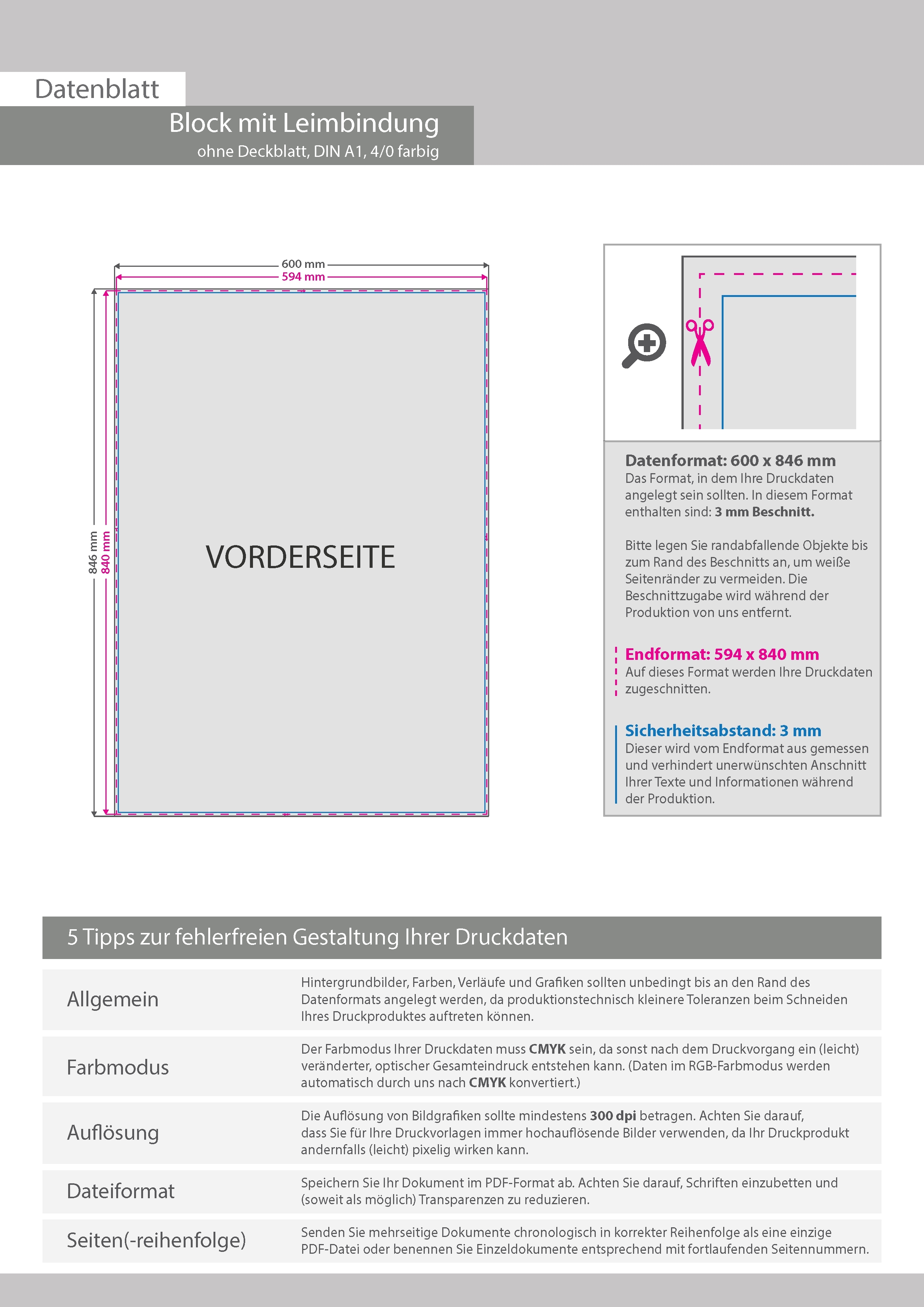 Block mit Leimbindung, DIN A1, 100 Blatt, 4/0 farbig einseitig bedruckt