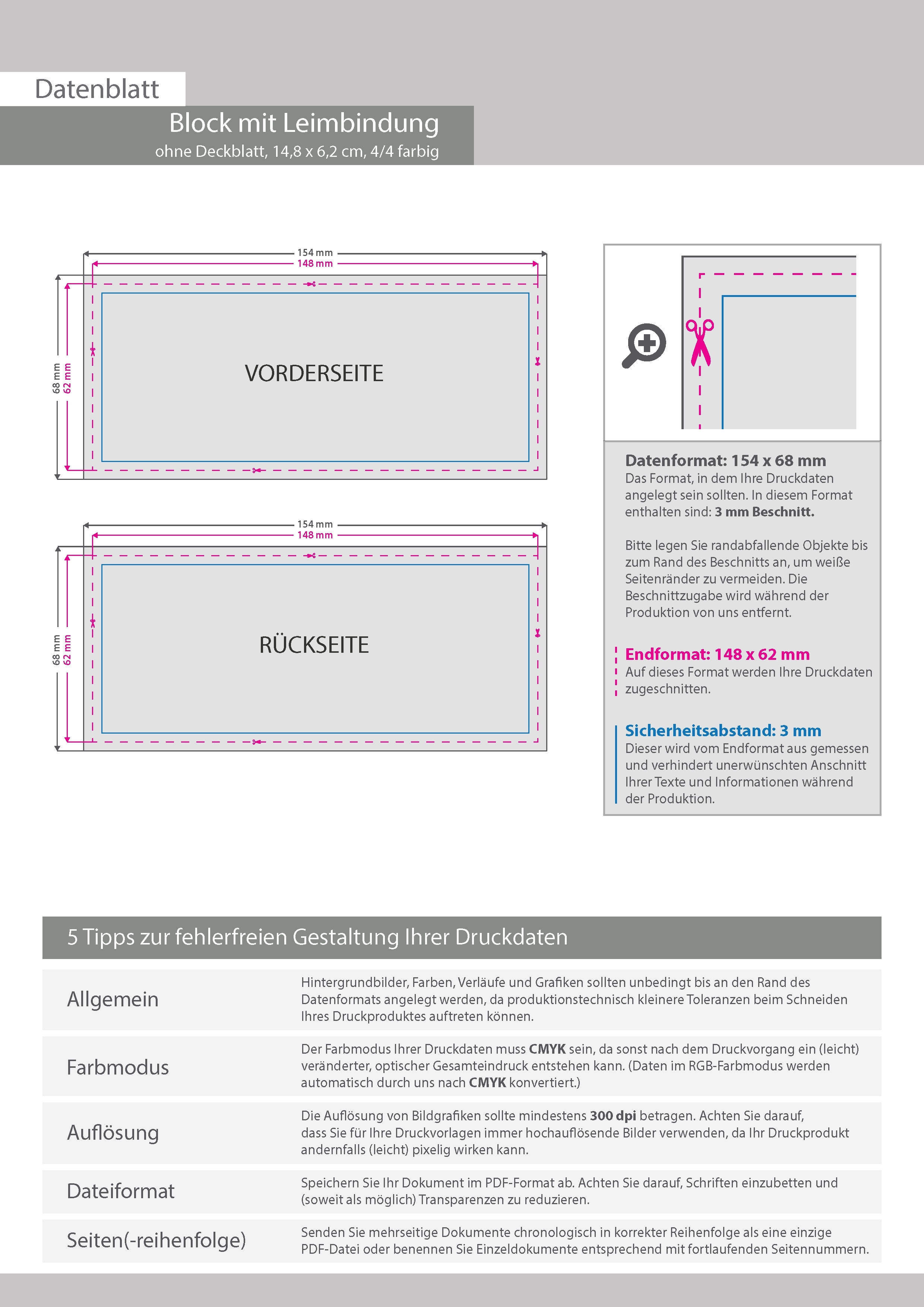 Block mit Leimbindung, 14,8 cm x 6,2 cm, 10 Blatt, 4/4 farbig beidseitig bedruckt