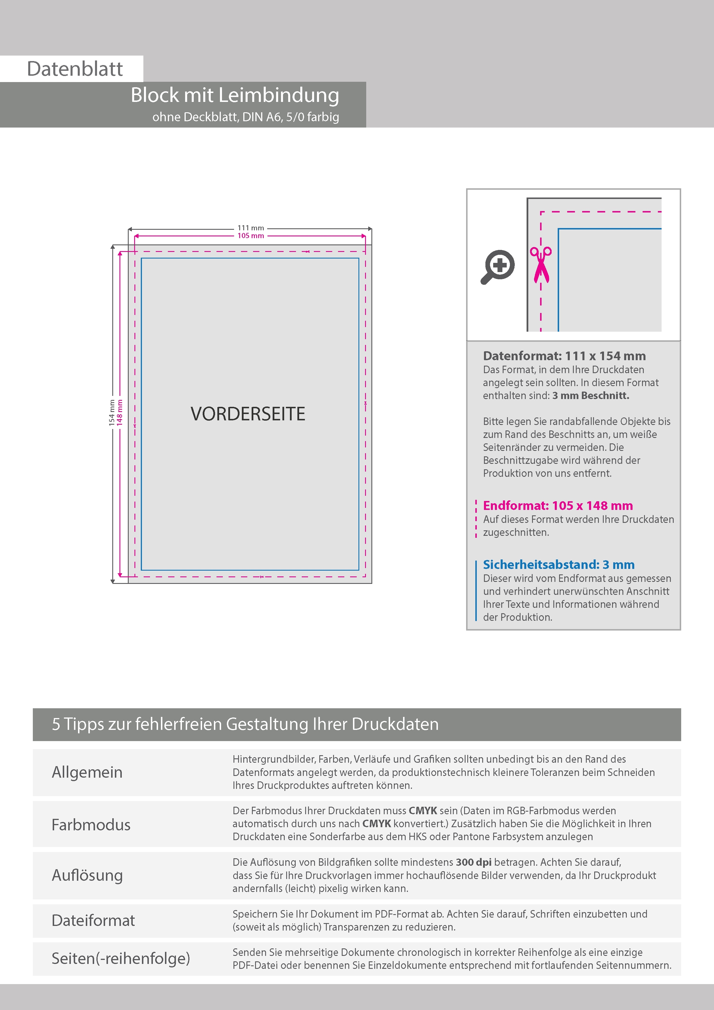 Block mit Leimbindung, DIN A6, 10 Blatt, 5/0 farbig einseitig bedruckt (CMYK 4-farbig + 1 Sonderfarbe HKS oder Pantone)