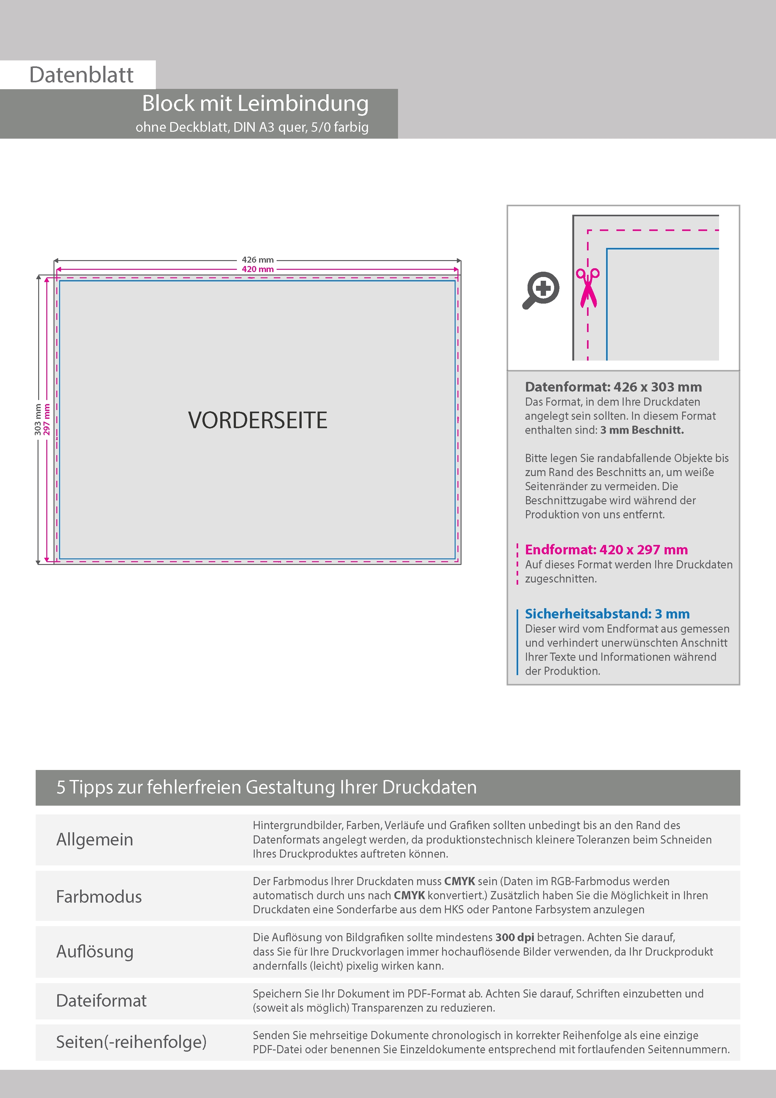 Block mit Leimbindung, DIN A3 quer, 100 Blatt, 5/0 farbig einseitig bedruckt (CMYK 4-farbig + 1 Sonderfarbe HKS oder Pantone)