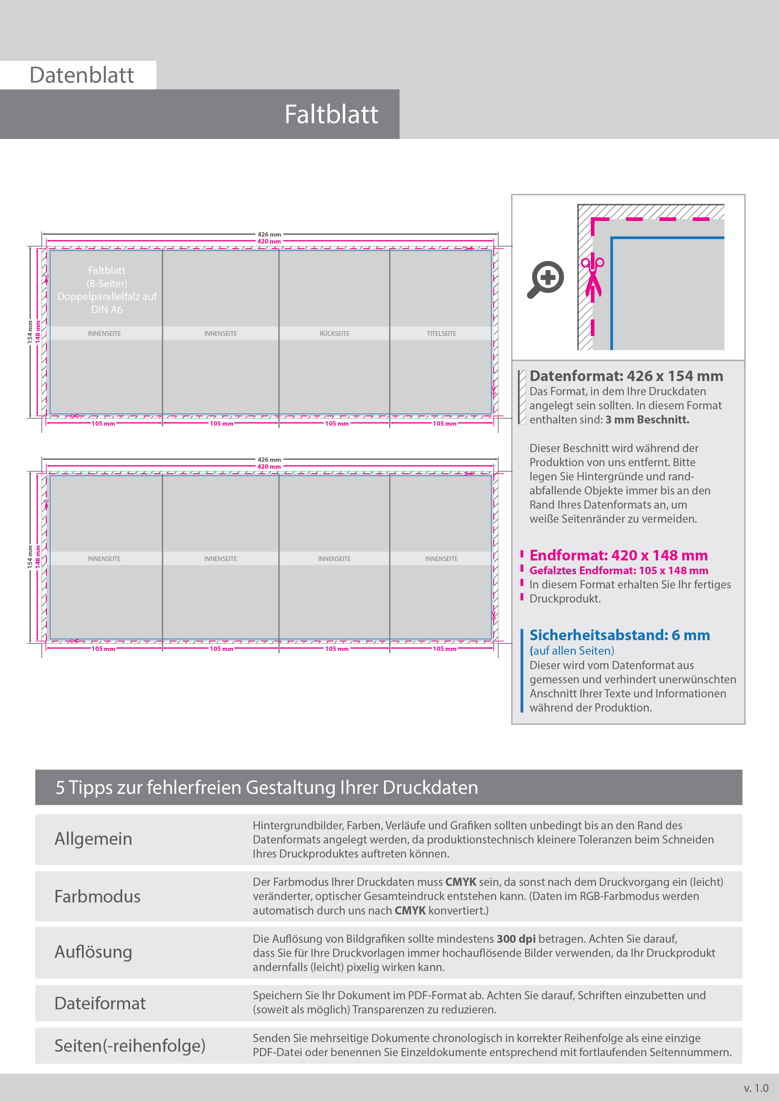 Faltblatt, gefalzt auf DIN A6, vertikaler Doppelparallelfalz, 8-seitig